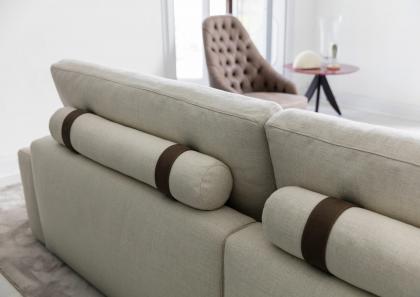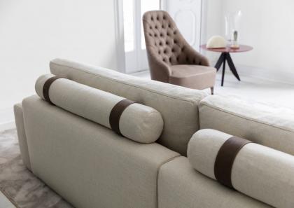 Cojines cilíndricos: están sujetos por cintas de piel nobuk, rematados con costuras personalizables y fijados a la estructura interna del sofá con botones a presión